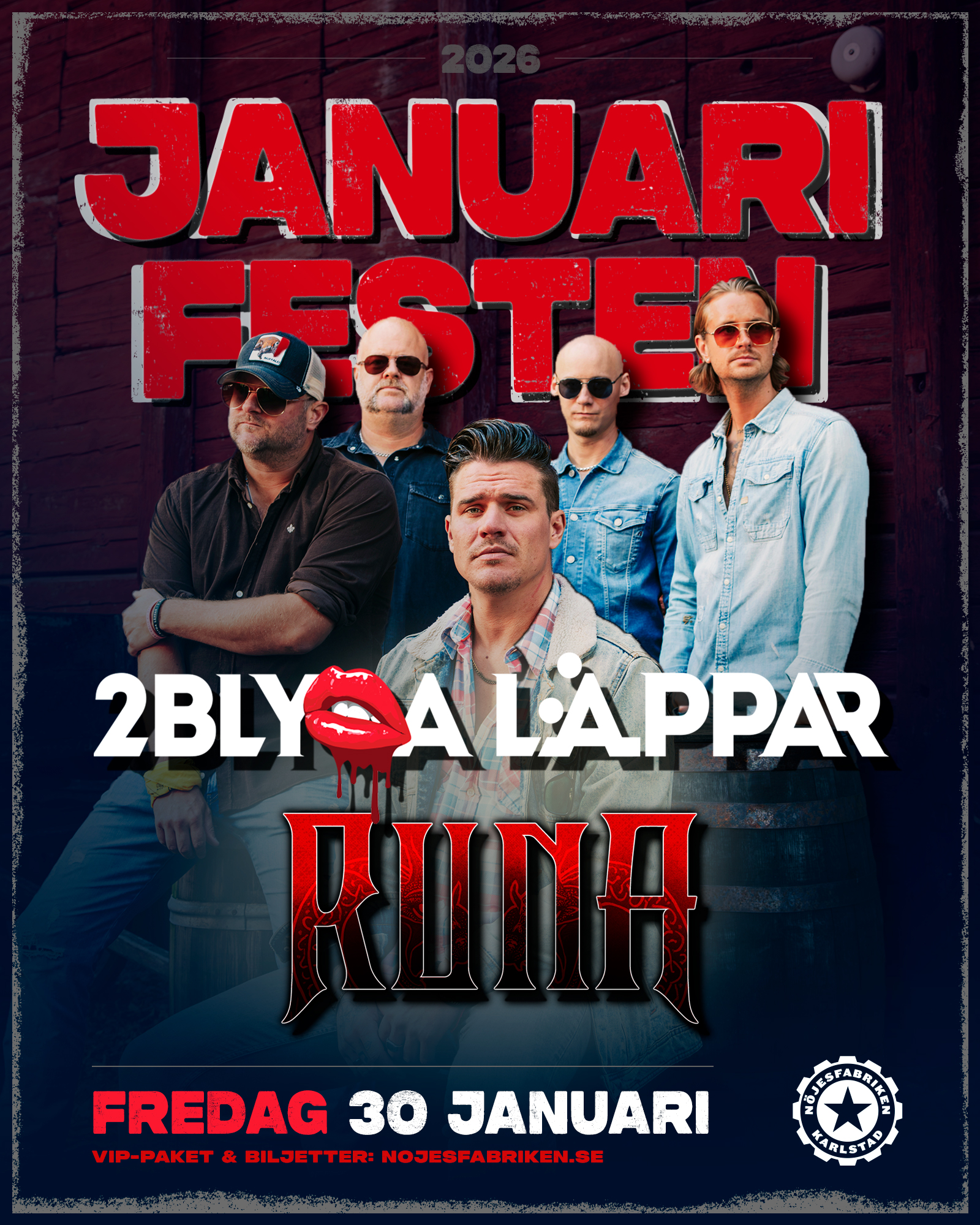 Januarifesten är tillbaka i dubbel bemärkelse! Partybandet och allsångskonnässörerna 2 Blyga Läppar tar med sig RUNA för en redig jäkla festkväll. Räkna med ett sjuhel…es drag!