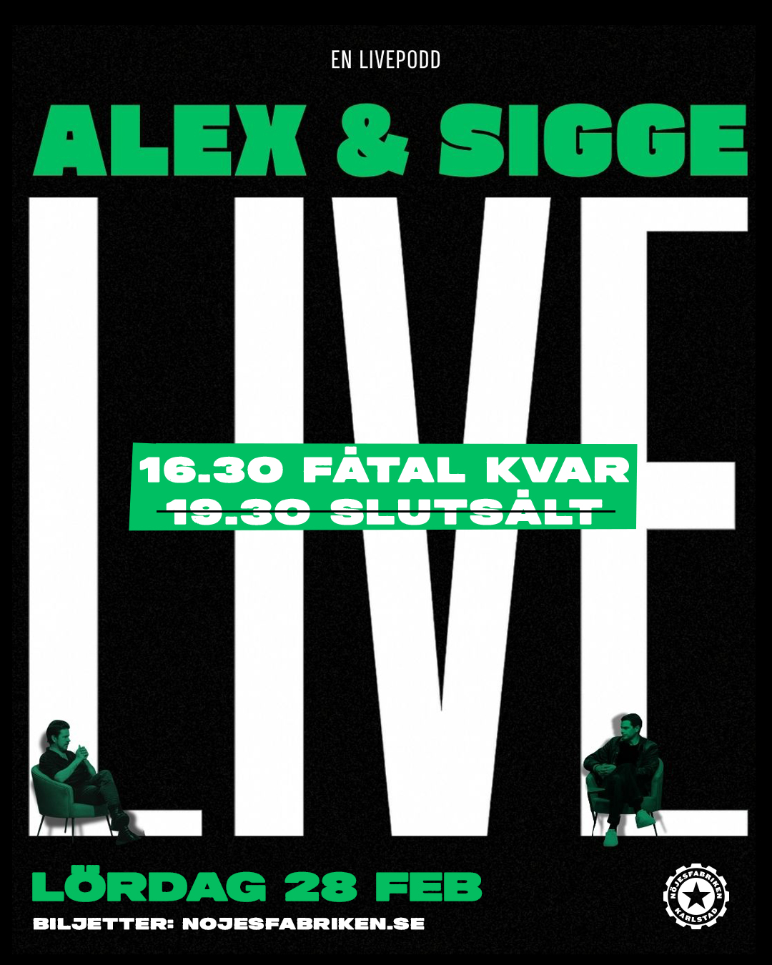 Efter utsålda turnéer och över ett decennium som Sveriges mest omtalade podd-duo har de fått oss att skratta, tänka och känna – vecka efter vecka. Nu lämnar Alex och Sigge poddstudion för att möta publiken live – med en helt ny liveföreställning som sent kommer att glömmas. Och du ska med!