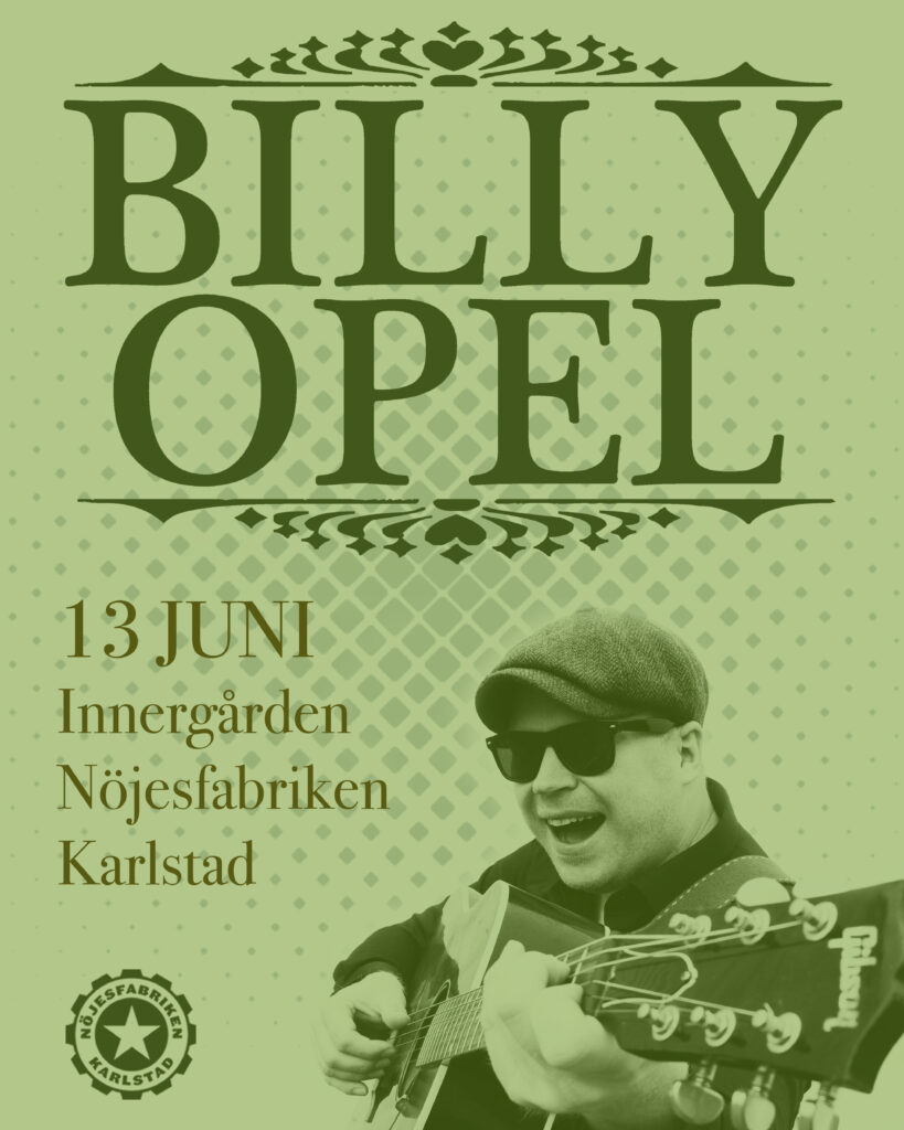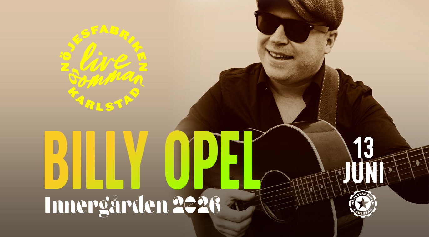 Med sina humoristiska sånger och betraktelser åker Billy Opel land och rike runt med gitarren i högsta hugg, och nu är det äntligen dags för honom att besöka Nöjesfabriken. Med låtar som: ”Bandit”, ”Grip mig”, ”Takbox på taket” och ”Ingenting olagligt” så lovar vi en höjdarkväll med både sång och dans!