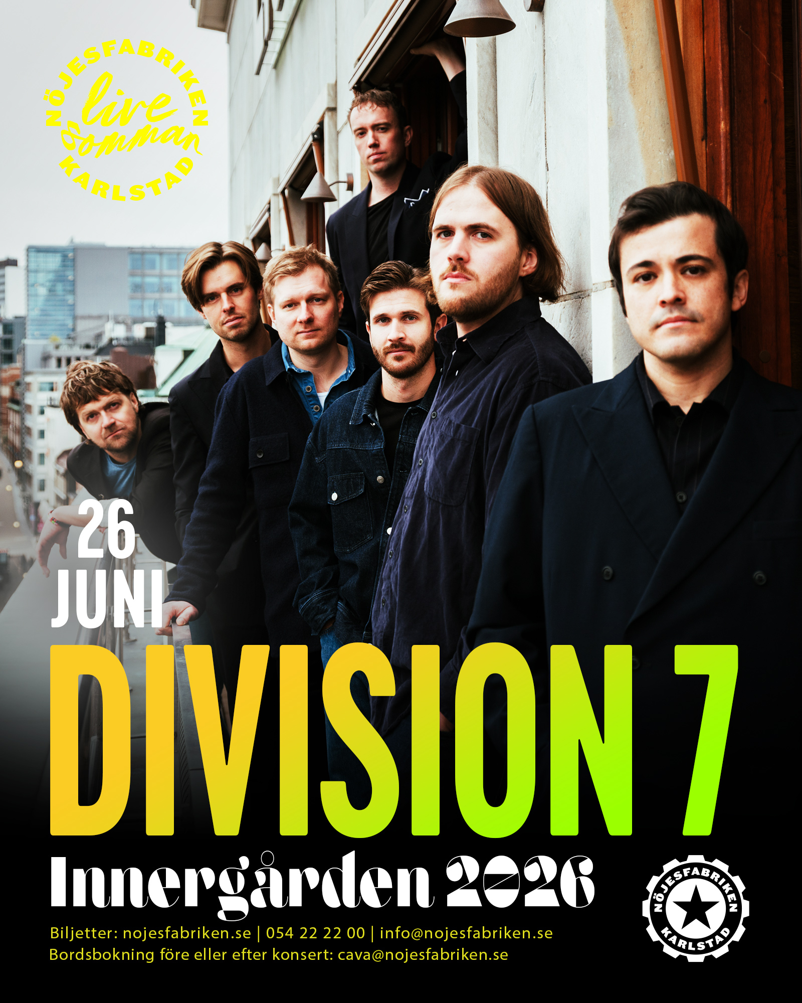 I en tid där trender kommer och går har Division 7 valt sin egen väg. Genom att envist vara sig själva har de på drygt tre år avverkat två hyllade fullängdsalbum, två EP:s och ett stökigt livealbum i ett rasande tempo. För en utomstående är framgångsreceptet tydligt: en aldrig sinande ström av starka låtar kombinerat med ett furiöst, väloljat livemaskineri som nött mil efter mil längs de svenska vägarna. Senast Division 7 var på Nöjes gjorde de ett bejublat framträdande i Kristallbaren. Nu är det dags för bandet att ta över Innergårdsscenen!