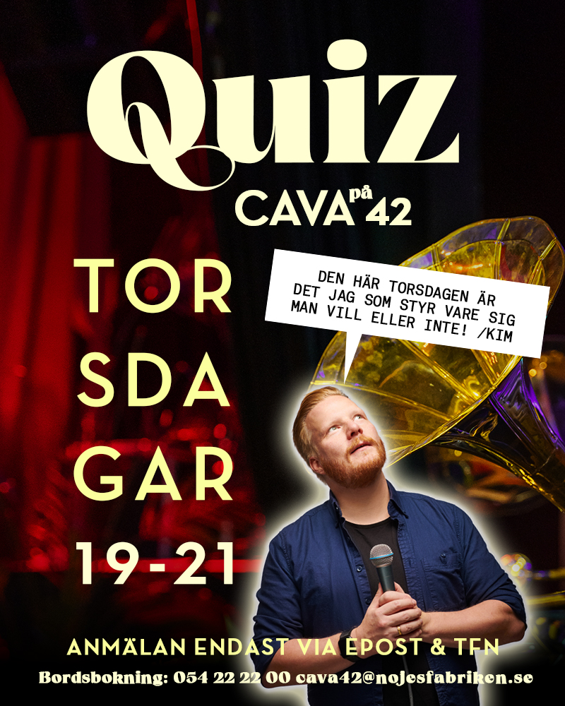 Quiz inne i mysiga CAVA 42! Denna torsdag återvänder vår QuizMäster Kim för en one-night-only & bjuder in till klurigheter och gött häng med fina priser i potten!.